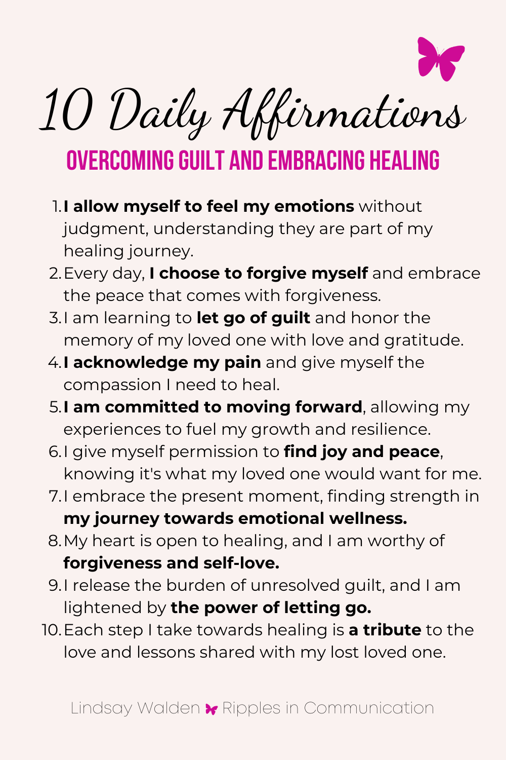Navigate the path of healing from guilt after losing a family member with these empowering daily affirmations. Embrace forgiveness, self-compassion, and the journey towards emotional wellness. Let these affirmations guide you towards peace and personal growth.