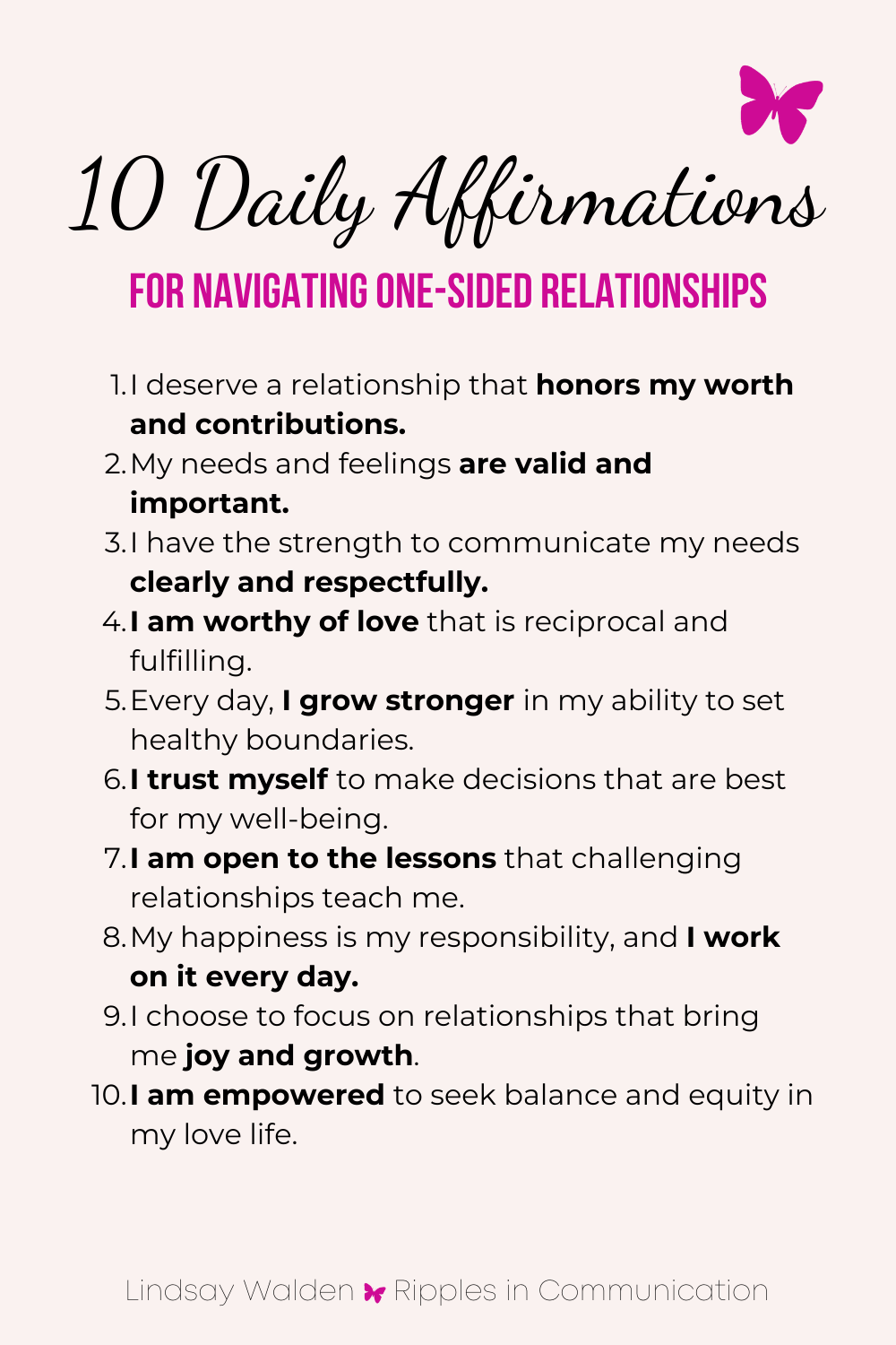 Empower your journey through one-sided relationships with these 10 daily affirmations. Embrace your worth, communicate your needs, and find the balance you deserve in love.