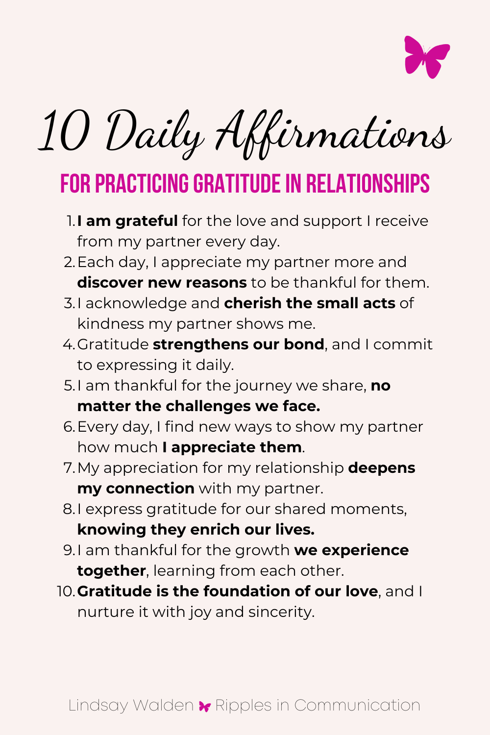 Discover 10 powerful affirmations to deepen gratitude and strengthen your relationship every day. Start your journey of appreciation and see the transformative impact on your partnership.