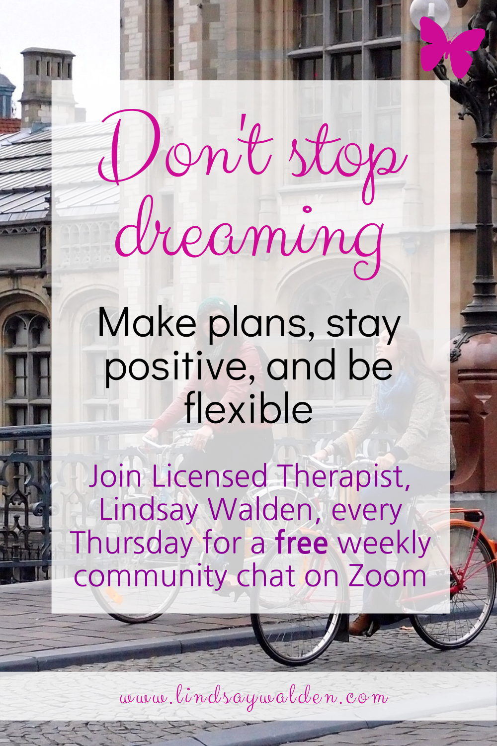 Lindsay’s Answer: Although I don’t want you to overwhelm yourself with making lots of plans, I also don’t want you to put our goals and dreams and hopes on hold. Rather than having firm dates on plans, this would be a time to make a more open ended goal list. Brainstorm some things that you would like to accomplish once you are able to resume activities. Give yourself the flexibility to shift if needed, and be realistic about what you’re planning. But please do not put yourself in a state of feeling stuck or like you can’t make plans or set goals for yourself.